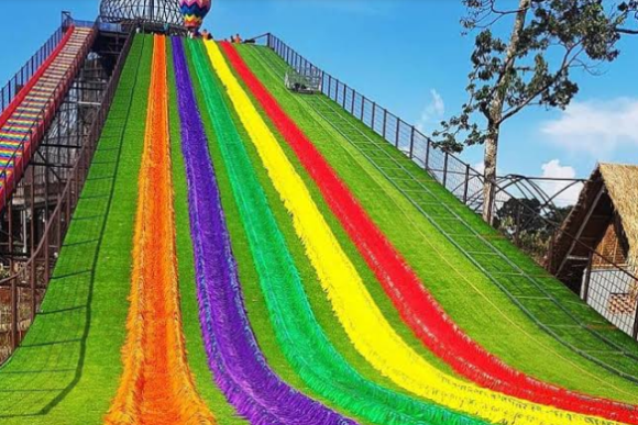 Beberapa spot tematik yang bisa Anda temukan antara lain seperti glamping, kampung Eropa, wahana permainan, perosotan pelangi, danau buatan, mini zoo dan berbagai macam spot uniklainnya.